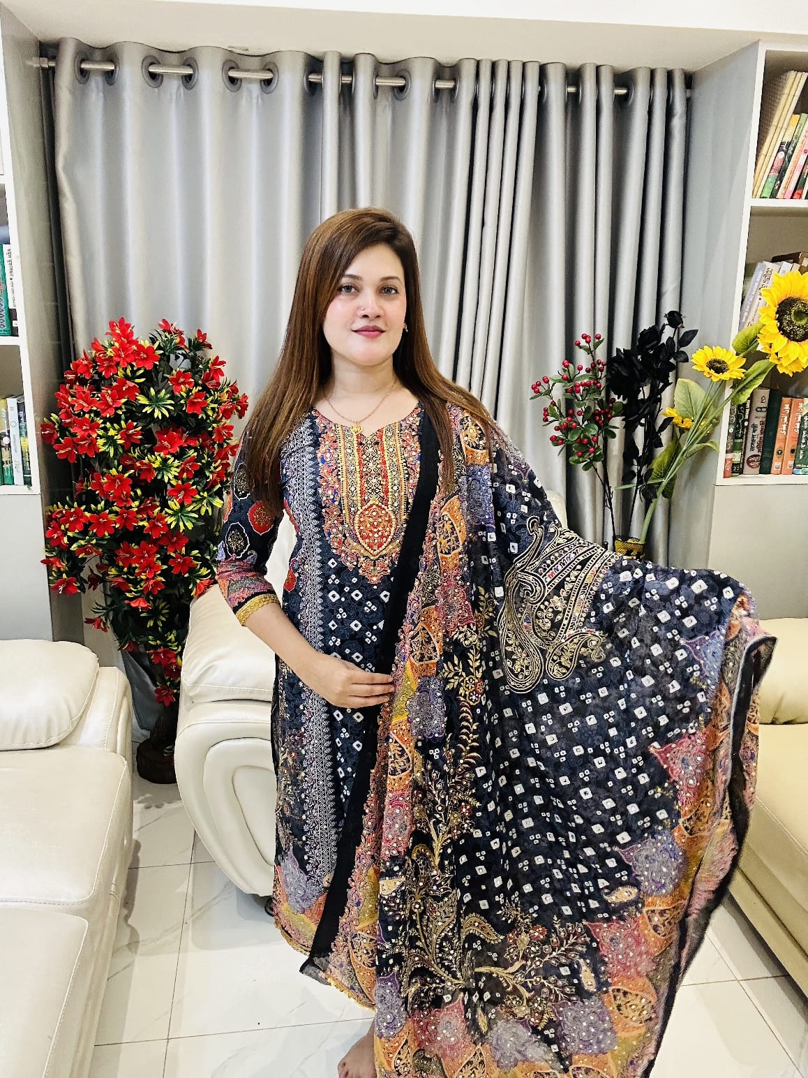 পুরো বডি আর ওড়নায় মিনারের কাজ, আর সেই সাথে গোল্ডেন কালারের পাথরের ফিনিশিং – এক কথায় লাক্সারির ছোঁয়া!"